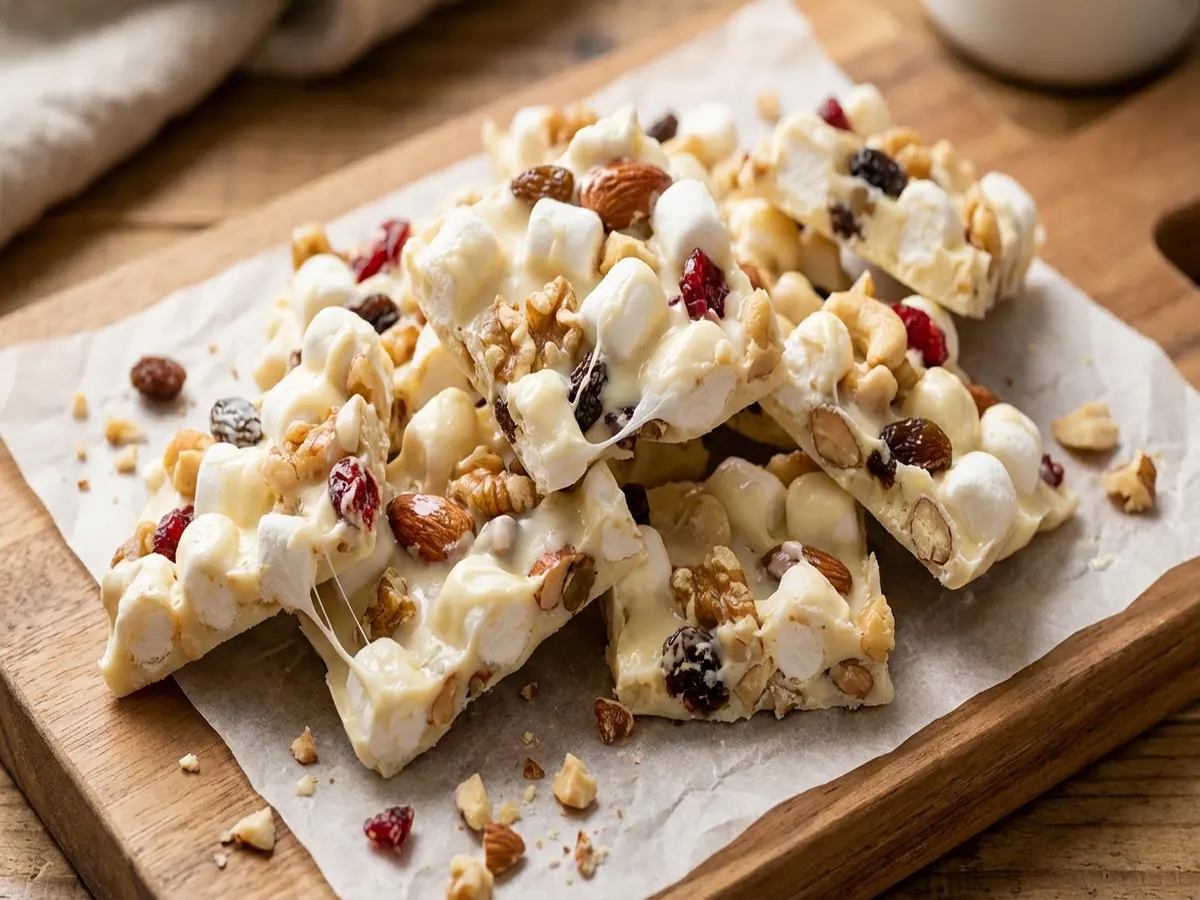 - 熱いうちにミックスナッツとドライフルーツを加えて素早く混ぜる