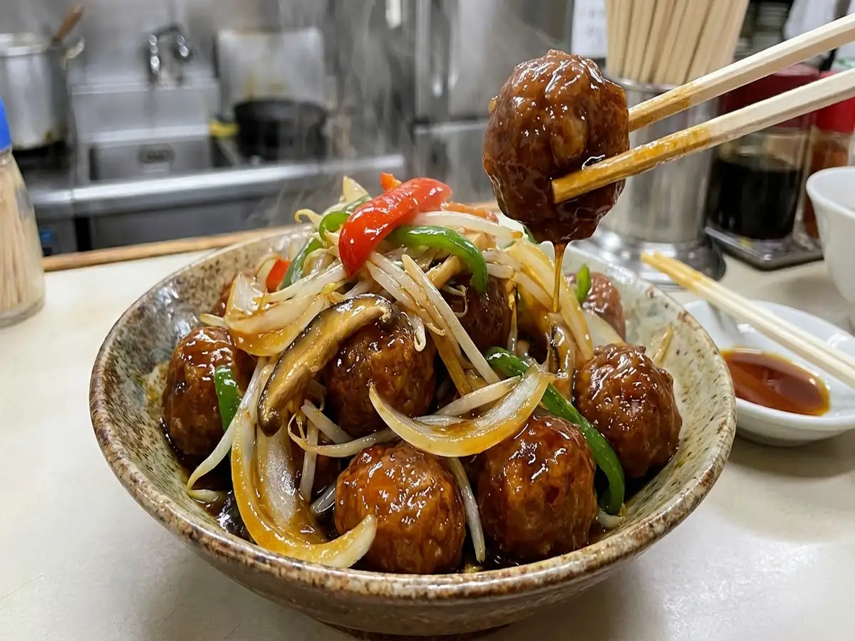 • 火が通ったら豚だんごを汁ごと、合わせた調味料を加えてひと煮立ちさせ、とろみがついたら火を止め器に盛る。追い酢をかけても。