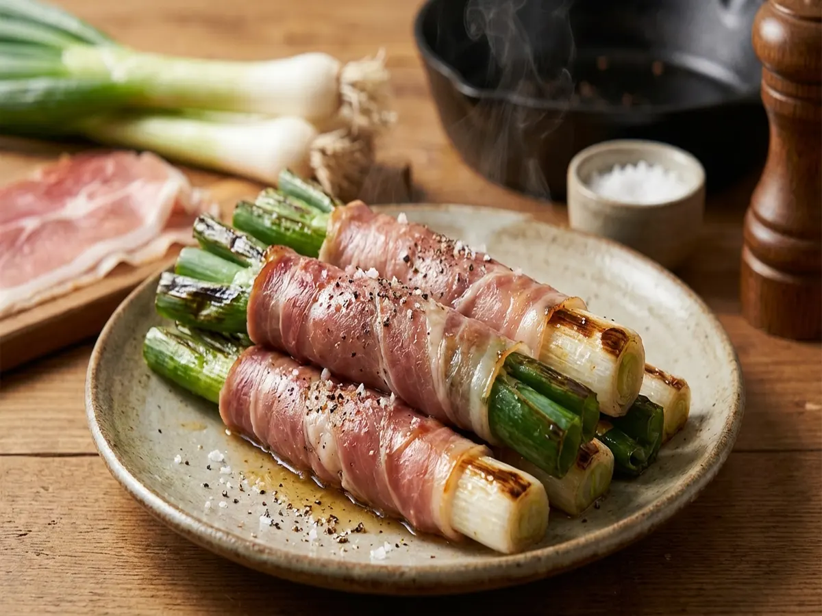 - 焼いた長ネギを生ハムで巻く