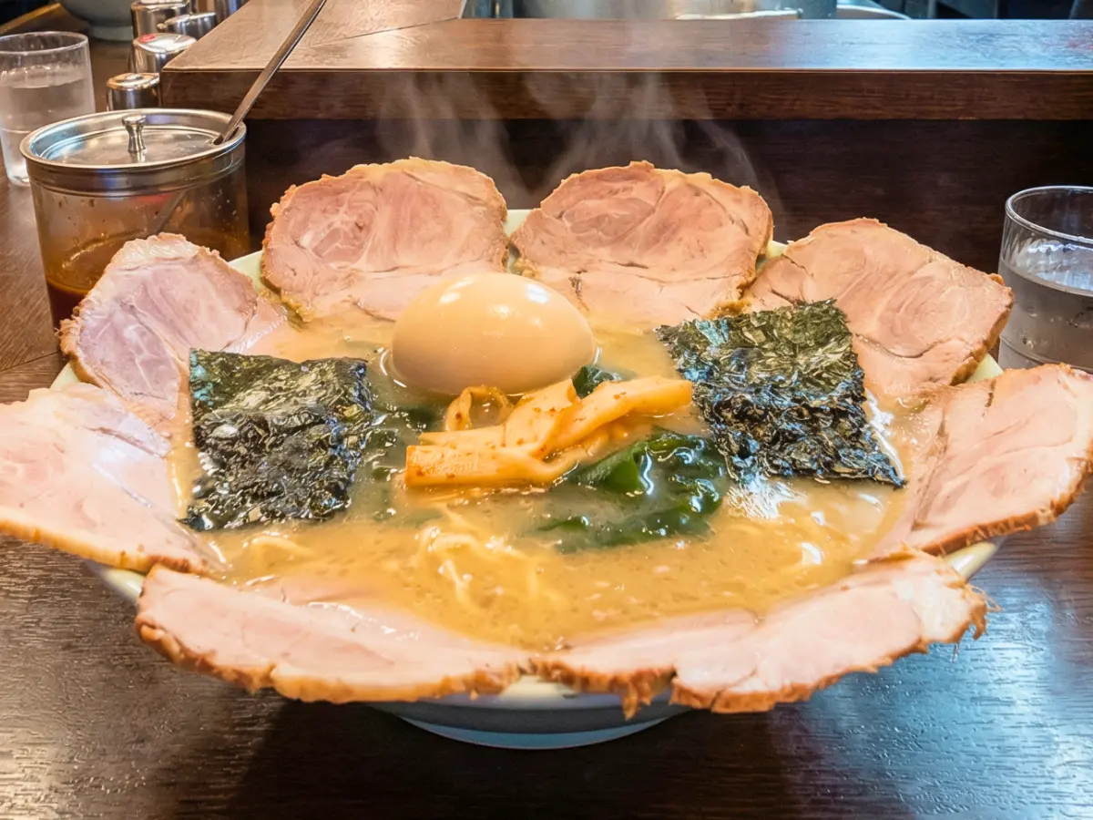 出来上がった豚骨スープに、自家製しょうゆをあわせ、そこに中細面合わせ、どんぶりの淵にチャーシューを9枚のせ、どんぶりの中心にワカメ、メンマ、のり、をのせたらチャーシューメンの完成!