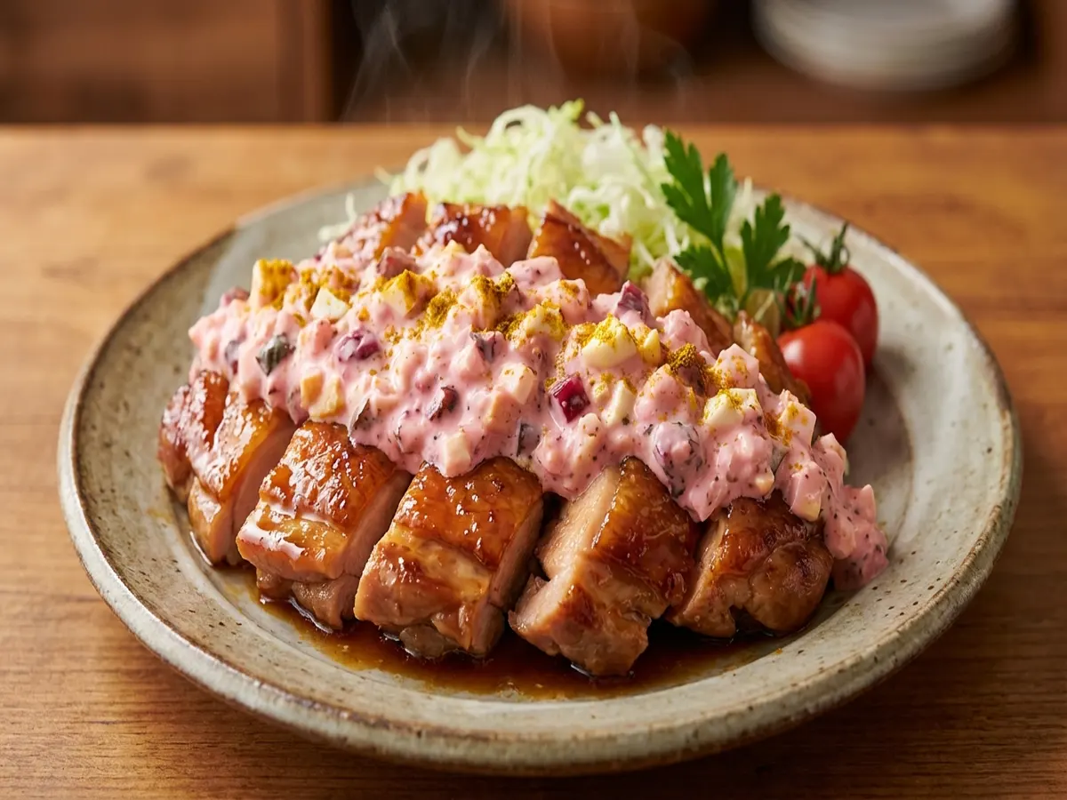 - 鶏の照り焼きを食べやすくカットして皿に盛り、タルタルソースをかけたら完成!