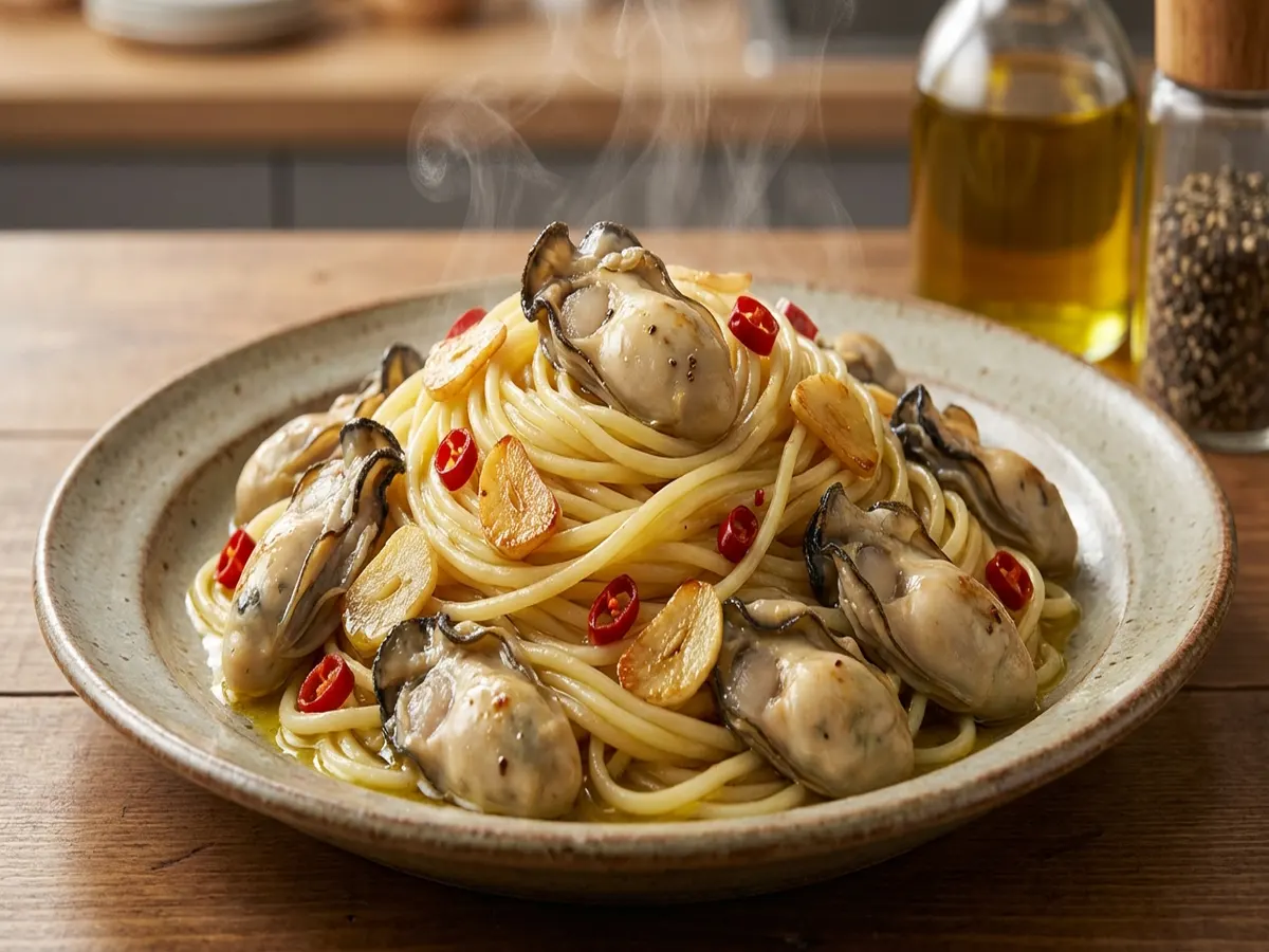 - 1分ほど茹でた牡蠣を加え、牡蠣の茹で汁を加える