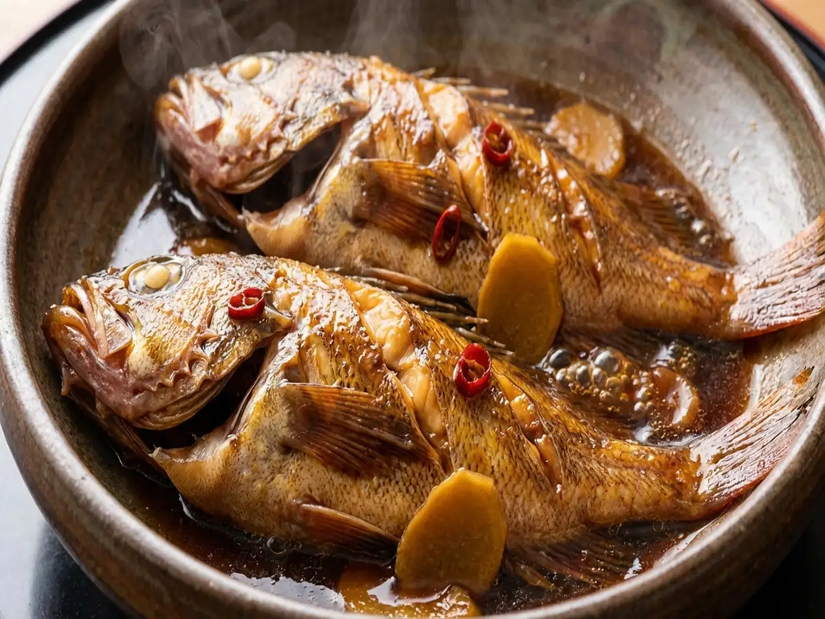 • キンキを鍋に入れ、唐辛子、生姜を入れ、落とし蓋をして10分ほど煮込む