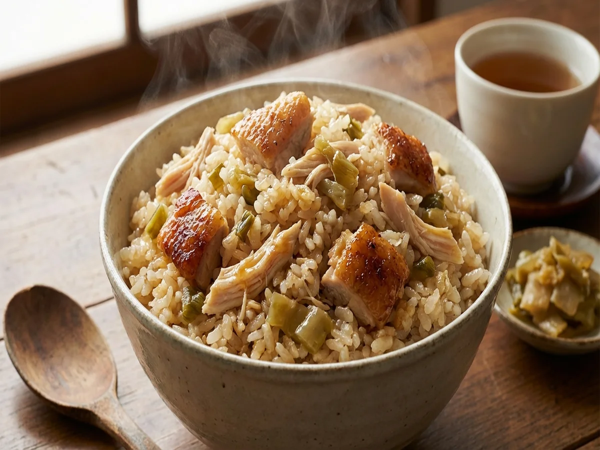 - 炊き上がったらさっくり混ぜながらオリジナルチキンの骨を取る
