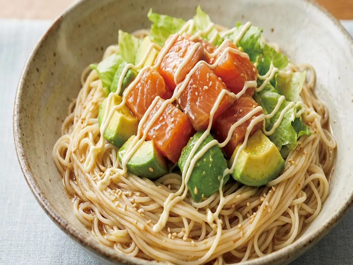 Course: そうめんレシピCuisine: そうめんレシピ, サーモンとアボカドのそうめんServings