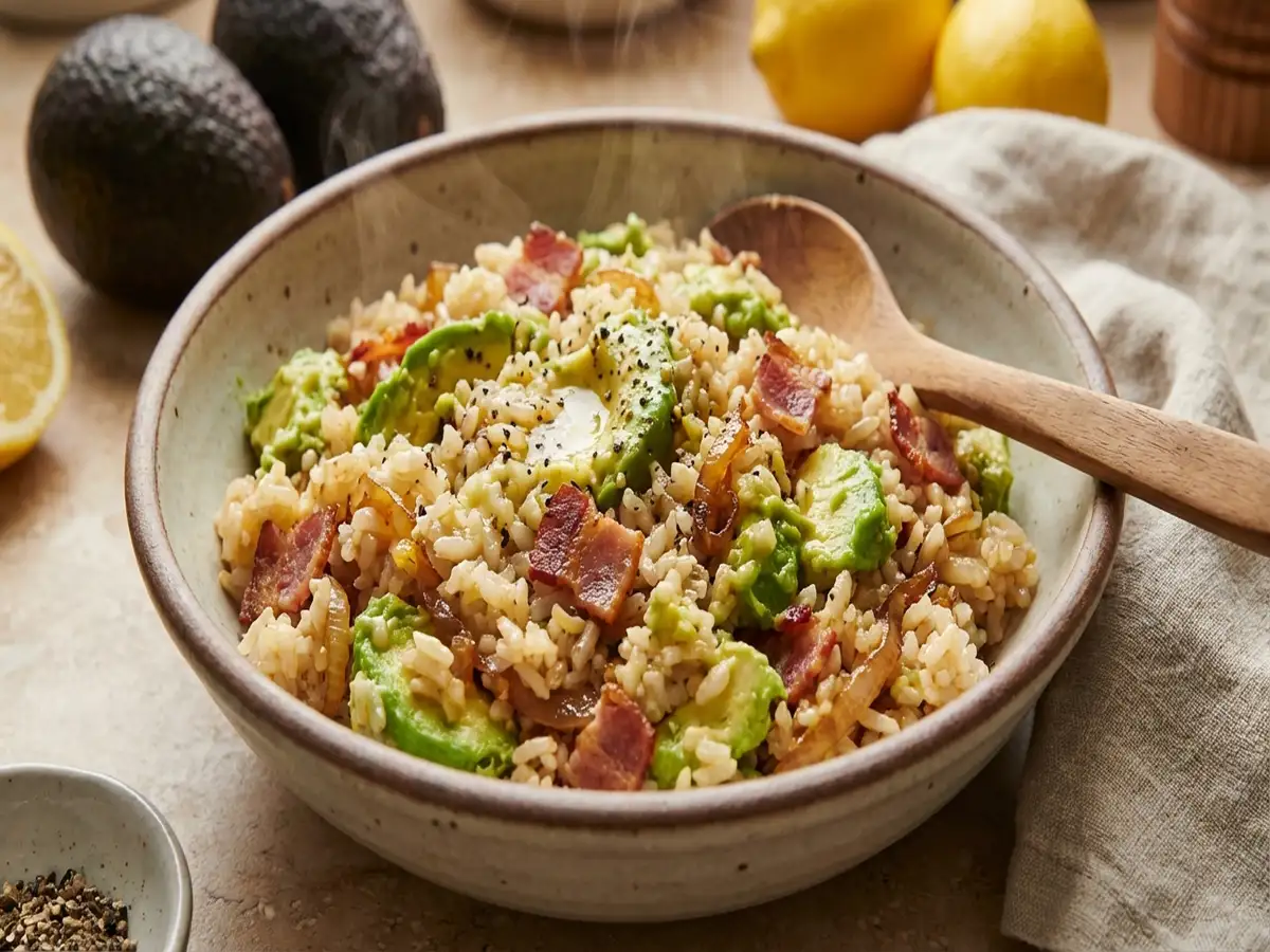 - 1にアボカド1/2、ベーコン40g、玉葱1/8個、コンソメ小さじ1と1/3、醤油小さじ1、バター10g入れ炊飯する。