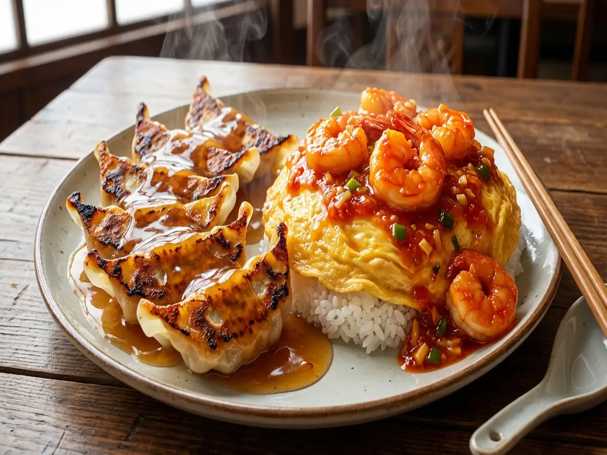 - 餃子をよく焼きで、天津飯を餡別で、さらにエビチリも注文する