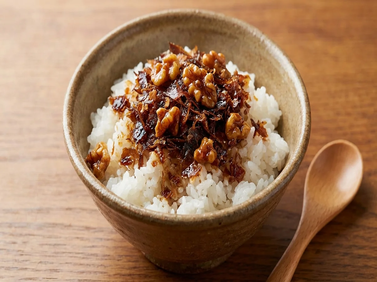 - かつおだしをとった後のかつお節、くるみを加える