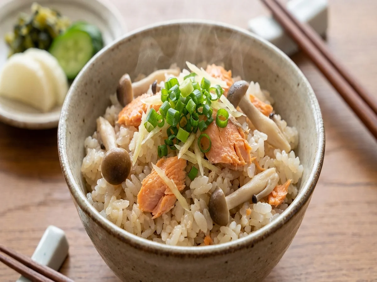 - 炊き上がったら鮭の皮と骨を取り除き、全体を混ぜ合わせて茶碗に盛り、お好みで小ネギを散らす